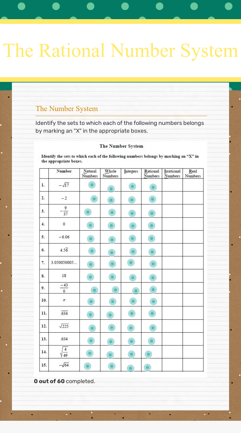 The Rational Number System Worksheet - Ubersichtskarte Der Pflichtfacher Khan Academy /. This product allows students to practice naming the subsets of the venn diagram used for the real number system, and classify different . All real numbers that are not rational numbers; Classify these numbers as rational or irrational and give . Symbol for rational number = ℚ. We encourage students to always start by making sure that all values are in the same notation system and then proceed from there.